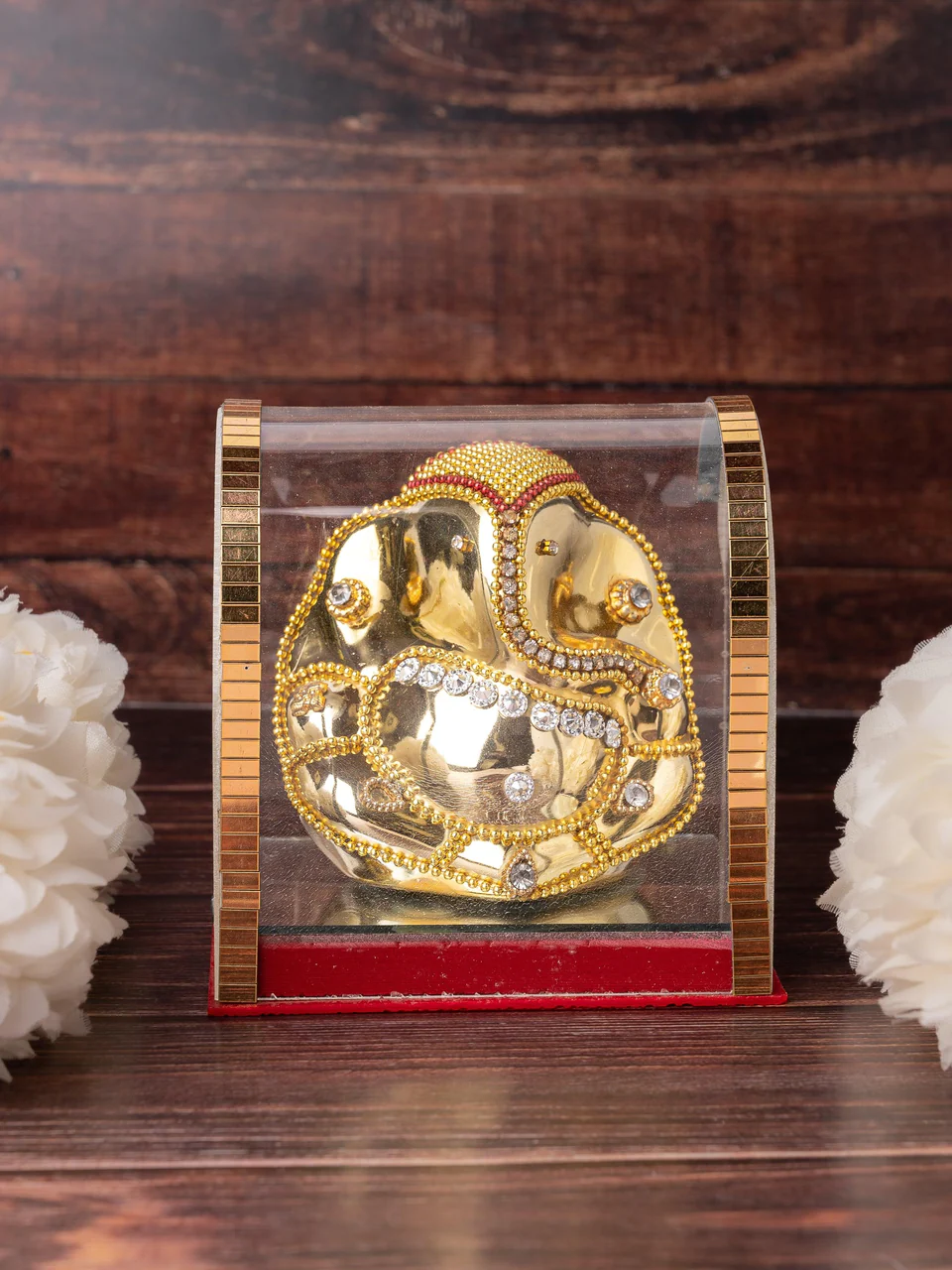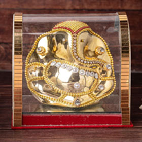 This beautiful golden Ganeshji is a must for your car dashboard. Handmade with very neat finishing, gold color gives a royal touch to this special idol. Placed and protected inside a sealed acrylic box, it is very easy to clean and maintain on daily basis.